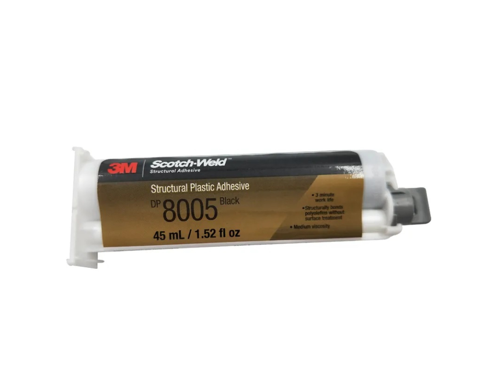 Der 3M Scotch-Weld DP8005 ist ein zähelastischer 2-Komponenten-Konstruktionsklebstoff auf Acrylatbasis zum hochfesten, schnellen Kleben von Kunststoffen mit geringer Oberflächenenergie wie PE, PP und TPE – ohne zusätzliche Vorbehandlung. Er bietet hohe Scherfestigkeit, guten Schäl- und Schlagwiderstand und baut Festigkeit sehr schnell auf; die Aushärtung erfolgt bei Raumtemperatur. Mechanische Befestigungen lassen sich damit in vielen Fällen ersetzen.